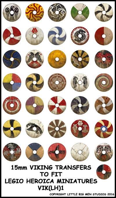 Viking transfers to fit Legio Heroica 15mm Vikings. The main round shields are 0.98cm in diameter and the smaller shield in the corner of the sheet is 0.8cm in diameter.