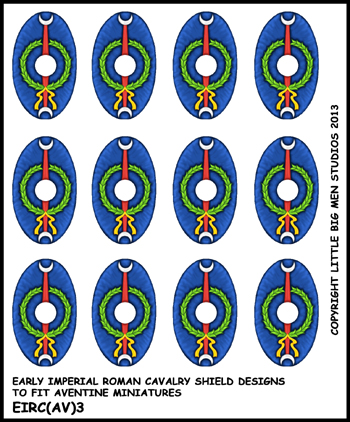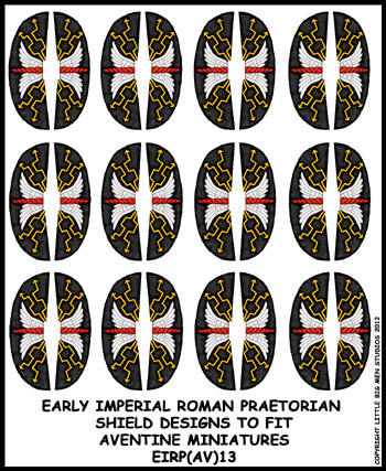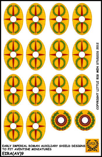 Early Imperial Roman Auxiliary transfer sheet to fit Aventine miniatures superb range of Romans. The transfers are for the shields, Standard bearer and musician bucklers and Vexilum. Ideally used with Avenines 16 figure unit packs.