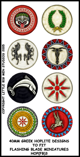 40mm Greek Hoplite shield transfers. These are 19mm in diametre and originally designed to fit on Flashing Blade figures. However they should work on Old Glory and other 40mm miniatures.